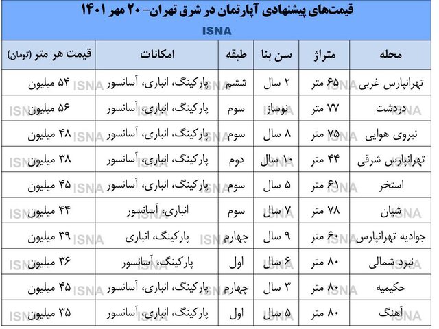چهار منطقه مذکور به طور کلی ۲۲.۶ درصد از کل معاملات مسکن شهر تهران در شهریور ۱۴۰۱ را به خود اختصاص دادند. بررسیها نشان میدهد بخش عمدهای از ساکنان مناطق شرقی تهران را اقشار متوسط تشکیل میدهند. عمده آپارتمانهای این مناطق از نوع کوچک و متوسط متراژ است. با این حال حجم قابل توجهی واحد بزرگ متراژ در منطقه تهرانپارس غربی برای فروش عرضه شده که تناسب چندانی با توان خرید متقاضیان ندارد.
