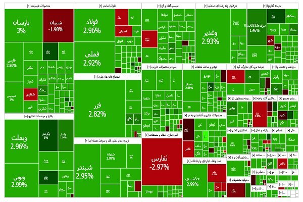 نمادهای «فارس»، «فملی»، «فولاد»، «وبملت»، «پارسان»، «شستا» و «شپنا» بیشترین تأثیر مثبت را بر شاخص کل گذاشتند.
